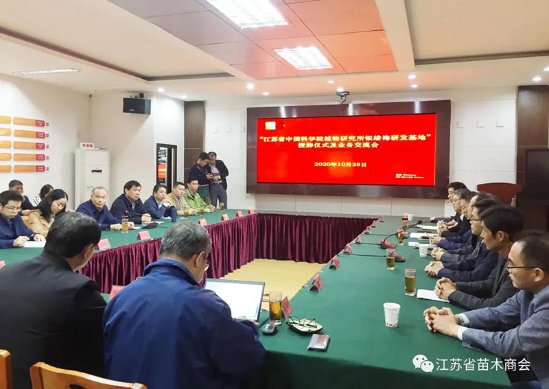 2020年10月28日上午,在宜兴西渚镇政府三楼会议室,举行“江苏省中国科学院植物研究所银缕梅研发基地”授牌仪式,并进行业务交流 。省中科院领导和专家、宜兴市人民政府、宜兴市林业局及镇政府有关领导30多人参加活动。江苏省苗木商会执行会长戴锁方、常务副会长朱允芬及商会办公室有关同志受邀参加活动。