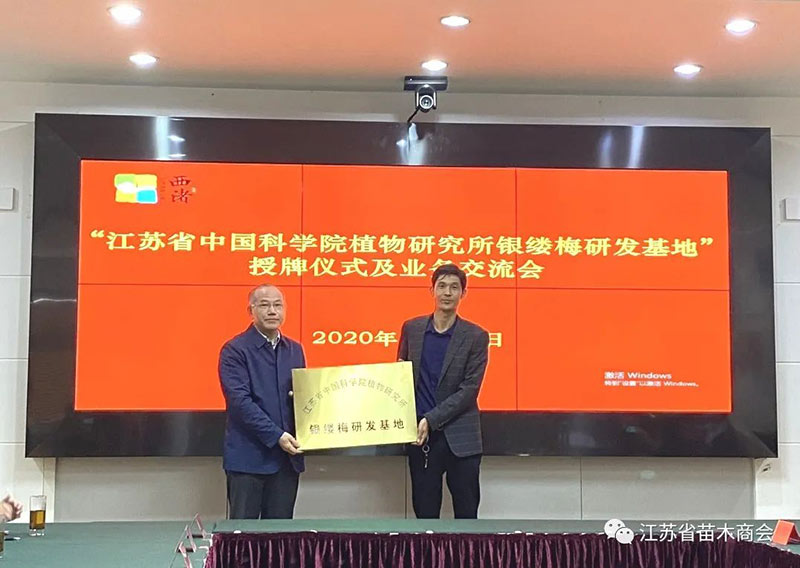 江苏省中国科学院植物研究所所长薛建辉为宜兴市神池园林绿化工程有限公司董事长夏兵授牌。